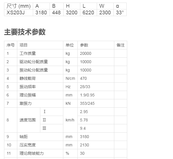 XS203J振動壓路機是由徐工集團工程機械股份有限公司自主研發的一款高效節能超重型機械驅動單鋼輪振動壓路機。該產品總體參數匹配合理,運用低轉速發動機、液壓阻尼控制技術,節能降噪效果明顯;運用“三心合一”技術,優化傳動系統,使壓實性能和效率得到有效提升;采用自主研發的新型電控操作系統,提升了操作舒適性;研發的離合自動緩沖技術,使傳動系統的可靠性顯著提高。主要適用于對地面的壓實,適用于卵石、砂性土壤、冰磧土、爆破巖石和粘性土壤的壓實作業,也適用于各種大型工程中對混凝土、穩定土的基礎材料的壓實,是建設高等級公路、機場、港口及工業建筑工地的理想壓實設備。