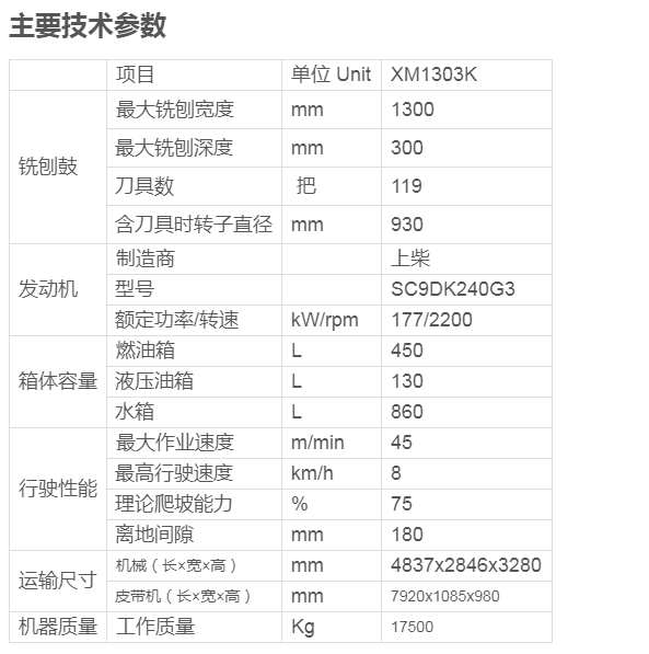 XM1303K是一款具有高性能的一米三銑刨機,主要用于公路、城鎮道路、機場、貨場、停車場等瀝青混凝土面層的開挖翻新。可以高效低清除路面癰包、油浪、網紋、車轍等;亦可開挖路面坑槽及溝槽;還可用于水泥路面的拉毛及面層錯臺的銑平。該設備工作效率高,施工工藝劍達,銑刨深度易于控制,操作方便靈活,機動性能好,銑刨的舊料能直接回收利用,可廣泛地用于瀝青路面的維修翻新養護施工之中。